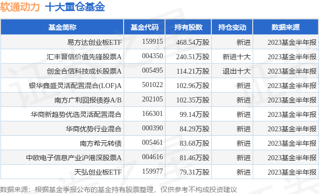 根据2023基金半年报公募基金重仓股数据,重仓该股的公募基金共226家,其中持有数量最多的公募基金为易方达创业板ETF。易方达创业板ETF目前规模为390.03亿元,最新净值1.912(10月17日),较上一交易日上涨0.27%,近一年下跌19.13%。该公募基金现任基金经理为成曦 刘树荣。成曦在任的基金产品包括:易方达深证100ETF联接A,管理时间为2016年5月7日至今,期间收益率为39.11%;易方达创业板ETF联接A,管理时间为2016年5月7日至今,期间收益率为-5.62%;易方达深证100ETF,管理时间为2016年5月7日至今,期间收益率为34.31%;刘树荣在任的基金产品包括:易方达深证100ETF联接A,管理时间为2017年7月18日至今,期间收益率为20.29%;易方达创业板ETF联接A,管理时间为2017年7月18日至今,期间收益率为17.18%;易方达深证100ETF,管理时间为2017年7月18日至今,期间收益率为18.58%;