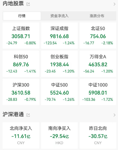 A股今日,低开低走,深成指、创业板指均跌超1%,创出年内新低。截至收盘,沪指跌0.80%,深证成指跌1.24%,创业板指跌1.20%。