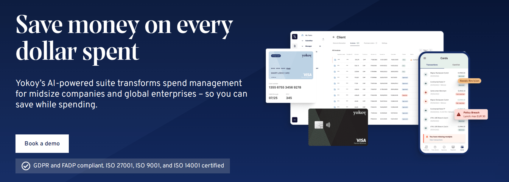 无论是应付账款、费用报销、旅行预订还是公司信用卡交易,Yokoy都可以协助削减直接和间接成本并持续优化财务流程。从数据输入到交易匹配和验证,Yokoy用人工智能驱动的自动化处理取代了手动工作,最大限度地提高了效率并降低了流程成本。通过自动化工作流程和内置的合规性检查,Yokoy最大限度地减少了发票和费用报销审批的时间。最后,Yokoy高度重视信息和数据安全,严格遵循欧盟《通用数据保护条例》要求,并持有ISO 27001、ISO 9001和ISO 14001认证。