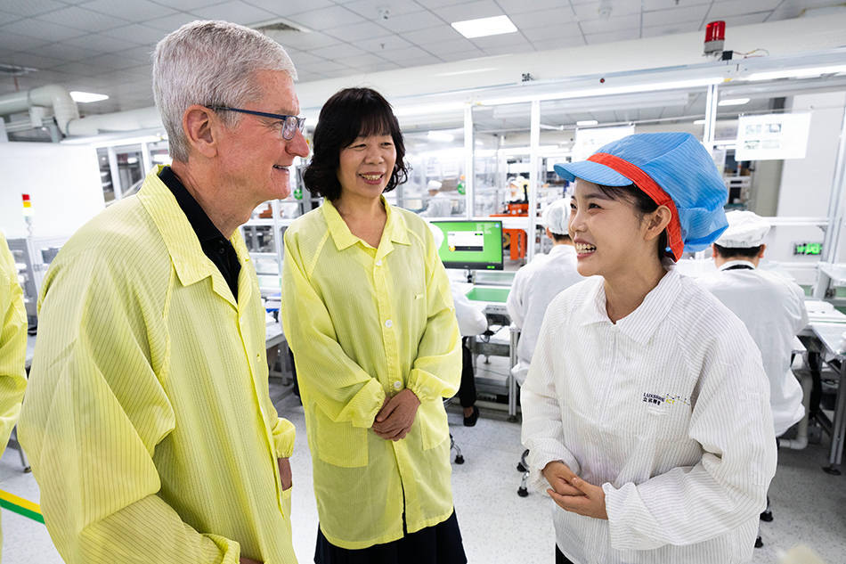 苹果CEO库克在立讯精密董事长王来春陪同下参观产线