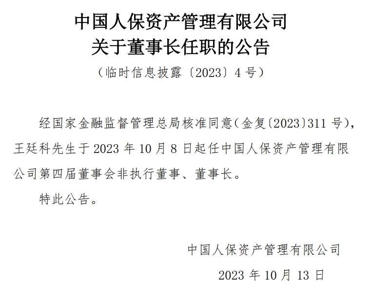 10月13日,中国人保资产管理有限公司(简称人保资产)官网发布董事长任职公告,王廷科于2023年10月8日起任中国人保资产管理有限公司第四届董事会非执行董事、董事长。