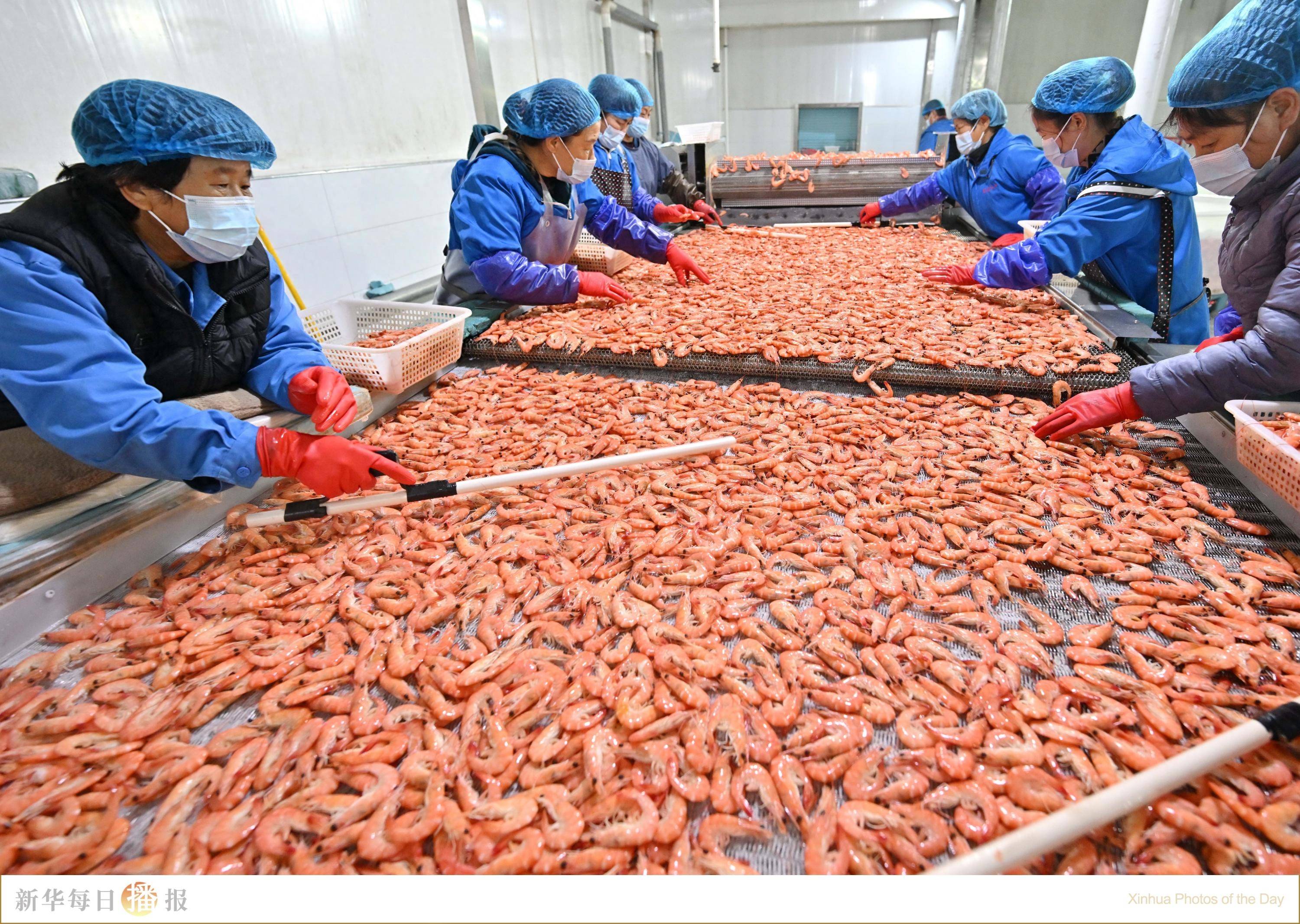 10月17日,工人在河北省唐山市曹妃甸区一家水产加工企业的南美白对虾加工生产线上工作。近日,河北省唐山市曹妃甸区利用盐场盐田卤水养殖的南美白对虾进入捕捞季节。近年来,曹妃甸区依托丰富的盐场盐田卤水资源,发展适盐性强的南美白对虾养殖,促进生态渔业发展。据介绍,目前该区利用盐场盐田卤水养殖南美白对虾面积达15万亩,年产南美白对虾达4000吨。