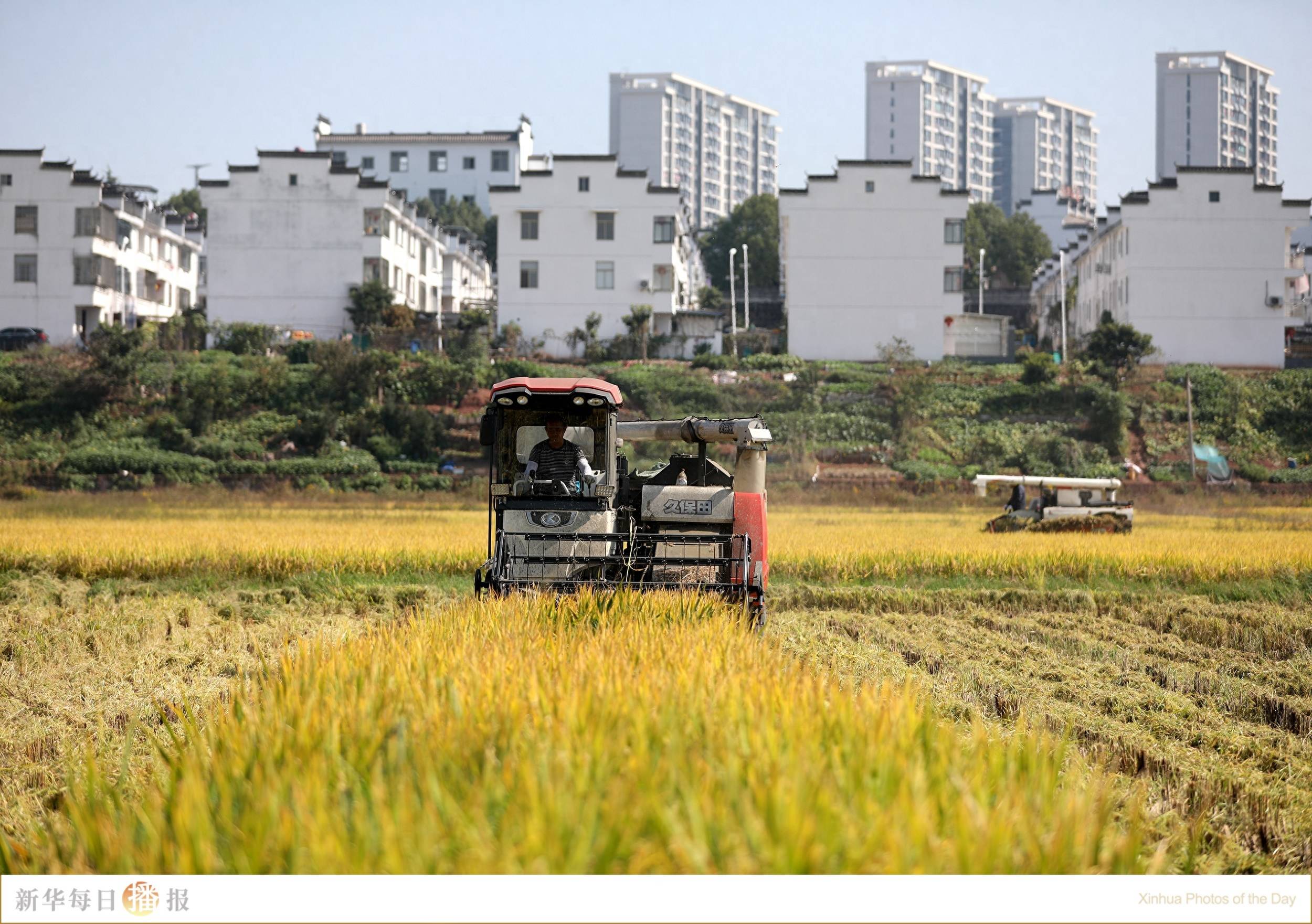 10月17日,在安徽省黄山市休宁县东临溪镇复耕的撂荒地里,联合收割机收割水稻。据最新农情调度显示,全国秋粮已收获过七成。目前,各地正抢抓农时确保秋粮颗粒归仓。
