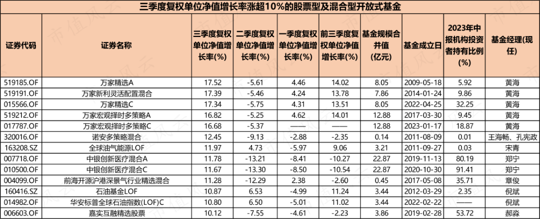 三季度涨幅超10%的基金中黄海管理的基金占据5席,虽二季度大炒科技线时其基金净值出现了小幅回撤,但整体看年内也是收正,平均收益率在14%左右。
