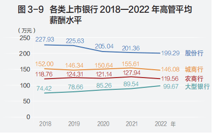 《报告》显示,2022年,上市银行执行董事、独立董事和高层管理者的平均薪酬水平分别为152.32万元、28.47万元和145.56万元,降幅分别为3.75%、3.03%和2.97%。