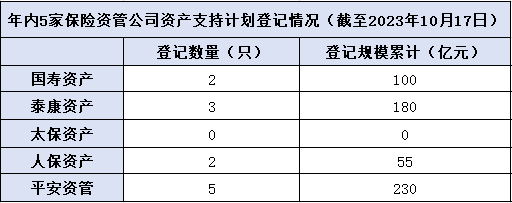 另据统计,2023年以来,截至10月17日,共有10余家保险资管机构登记资产支持计划53只,累计规模近3000亿元。其中,平安资管共有5只产品,累计规模230亿元;泰康资产登记3只产品,累计规模180亿元;国寿资产、人保资产各登记2只产品,规模分别为100亿元和55亿元。