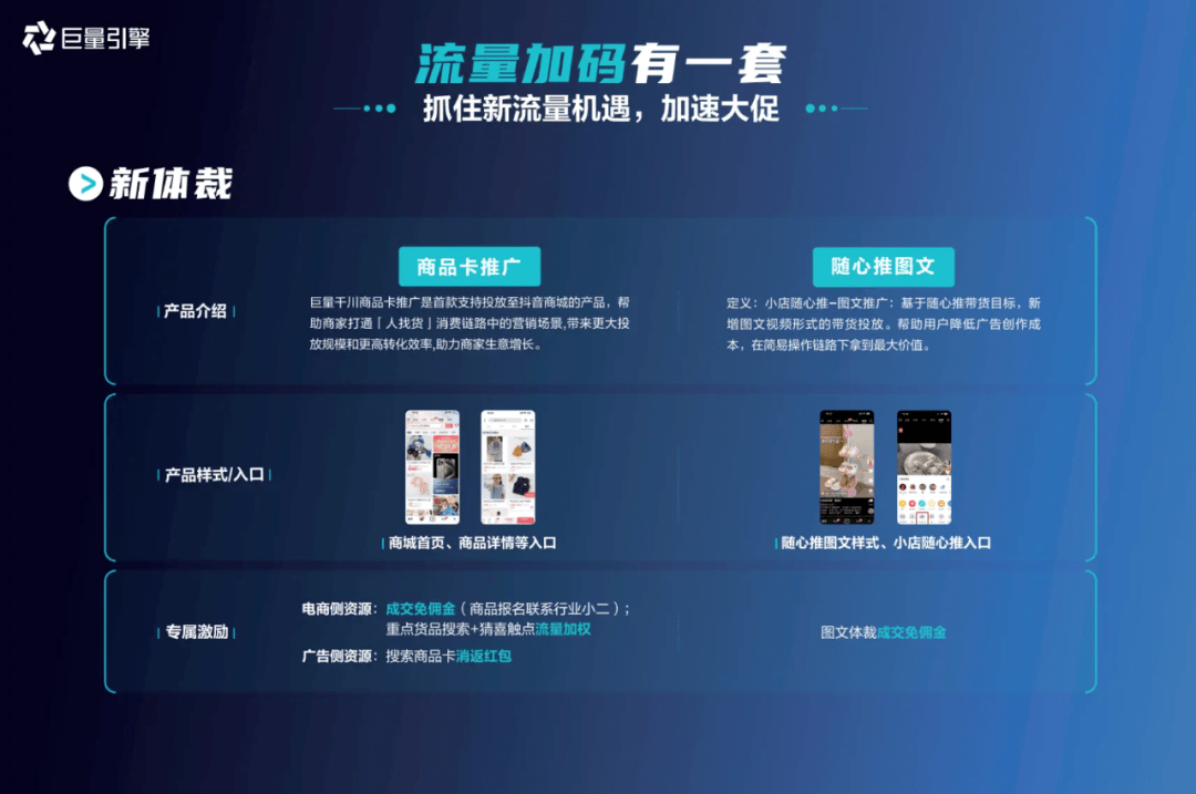 其一,为了让商家运营好商城,针对货架场,巨量引擎挖掘了商品卡和随心推图文的新体裁。