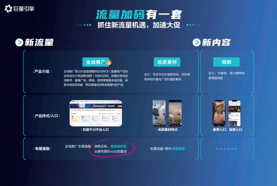 今年双11,在流量加码方面,巨量引擎有新体裁、新流量、新内容三大推力: