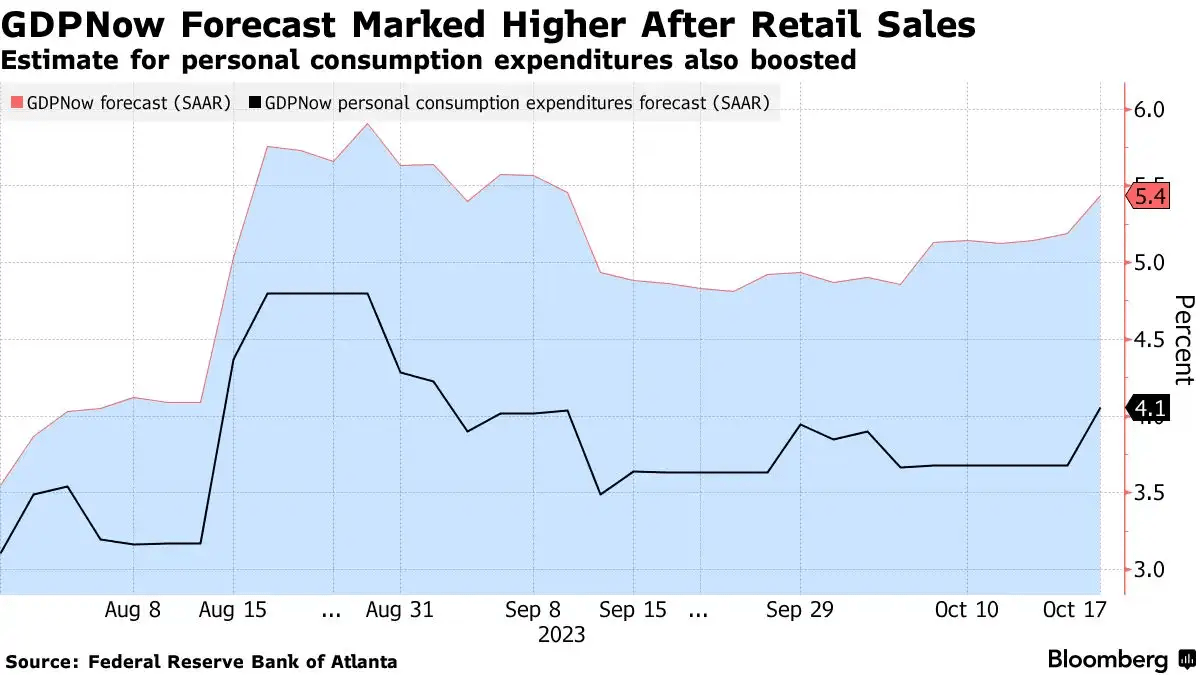 亚特兰大联储的GDPNow预测显示,第三季度经济按年率计算增长5.4%,这将是自2021年底以来最强劲的增长。个人消费可能增长4.1%,为同年第二季度以来最快。MO Capital Markets高级经济学家Priscilla Thiagamoorthy在一份报告中说:“强大的美国消费者继续推动需求,尽管存在一些不利因素(包括UAW罢工),但工厂仍在向前推进。