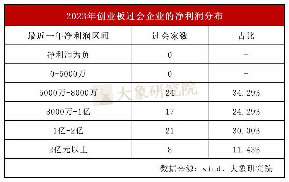 去年同期,创业板过会企业168家,其中在披露最近一年净利润年报的企业中,归母净利润在5000万-8000万的企业有67家,占比39.88%。在此区间更详细的统计,有51家企业在6000万-8000万中,占比76.12%。因此,可以说,去年创业板IPO净利润的要求在6000万以上。