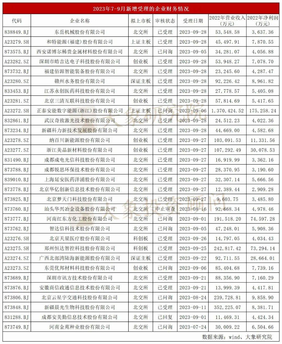 在7月、8月、9月沪深北交易所新增受理企业共31家,相比去年同期44家减少13家,同比下降29.55%。在这31家新增受理的企业中,申报北交所IPO的企业有20家,占比64.5%。2022年净利润最低为2909.18万元(华亿技术),净利润最高为 17.53亿元(正泰安能)。