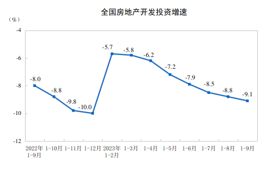 1—9月份,全国房地产开发投资同比下降9.1%,其中,住宅投资66279亿元,下降8.4%,跌幅继续扩大。