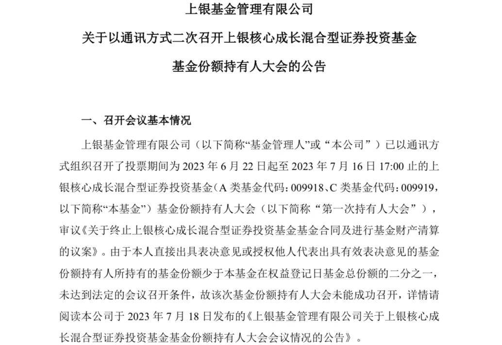 按照上银基金的最新公告,上银核心成长曾在今年6月至7月投票决定是否召开基金持有人大会,审议《关于终止上银核心成长混合型证券投资基金基金合同及进行基金财产清算的议案》(下称《议案》)。但由于未达到法定召开条件,未能成功召开。上银基金决定以通讯方式二次召开该基金的基金持有人大会,并继续审议前述《议案》。