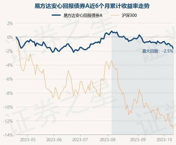 证券之星消息,10月18日,易方达安心回报债券A最新单位净值为1.87元,累计净值为2.969元,较前一交易日下跌0.38%。历史数据显示该基金近1个月下跌0.95%,近3个月下跌0.82%,近6个月下跌1.66%,近1年下跌1.35%。该基金近6个月的累计收益率走势如下图: