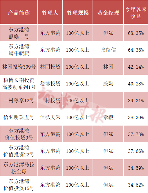 具体来看,但斌管理的东方港湾麒庭一号以68.35%的收益夺得百亿私募产品的收益冠军,东方港湾蜗牛爬爬以64.36%的收益排名第二。此外,东方港湾价值投资9号、东方港湾价值投资22号、东方港湾马拉松全球、东方港湾价值投资15号等多款由但斌管理的私募产品今年来收益率超30%,位居百亿私募产品收益率前十。