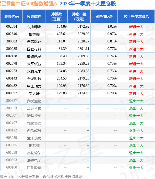 汇添富中证500指数增强A为指数型-股票基金,根据最新一期基金季报显示,该基金资产配置:股票占净值比93.65%,无债券类资产,现金占净值比6.24%。基金十大重仓股如下: