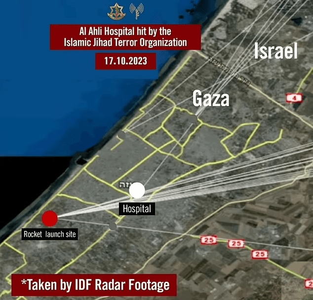 以色列雷达系统追踪了从加沙境内发射的火箭弹。哈加里说,以色列国防军弹道分析证实火箭弹是从距离医院很近的地方发射的。他说,大部分推进剂(火箭弹燃料)仍然可见,因为火箭弹的轨道很短。