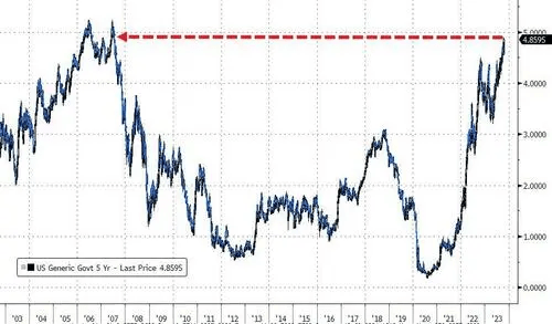5年期国债收益率上涨15.6个基点报4.878%,一度触及了2007年7月以来的最高水平。