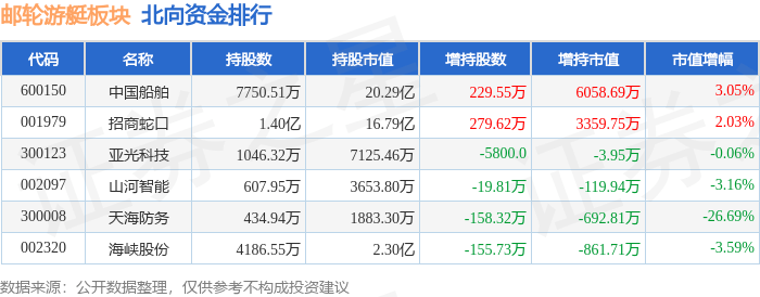 北向资金方面,当日邮轮游艇板块北向资金持股市值为40.65亿元,增持0.77亿元。其中增持最多的是中国船舶,增持了0.61亿元。减持持最多的是海峡股份,减持了861.71万元。邮轮游艇板块北向资金持股变动明细见下表: