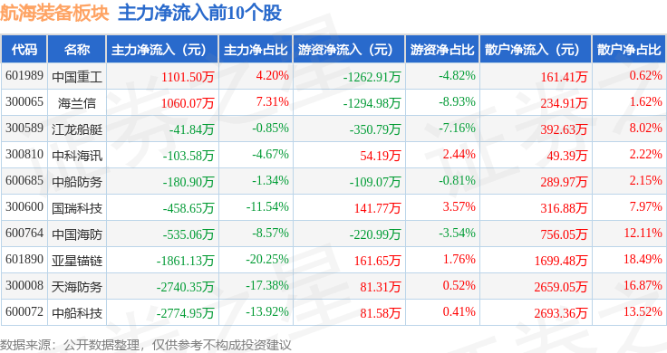 从资金流向上来看,当日航海装备板块主力资金净流出1.82亿元,游资资金净流出470.23万元,散户资金净流入1.87亿元。航海装备板块个股资金流向见下表: