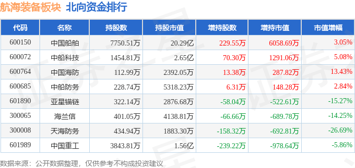 北向资金方面,当日航海装备板块北向资金持股市值为26.17亿元,增持0.49亿元。其中增持最多的是中国船舶,增持了0.61亿元。减持持最多的是中国重工,减持了978.64万元。航海装备板块北向资金持股变动明细见下表: