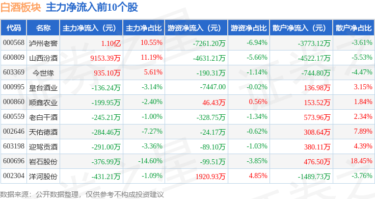 从资金流向上来看,当日白酒板块主力资金净流出3.59亿元,游资资金净流入8646.26万元,散户资金净流入2.73亿元。白酒板块个股资金流向见下表: