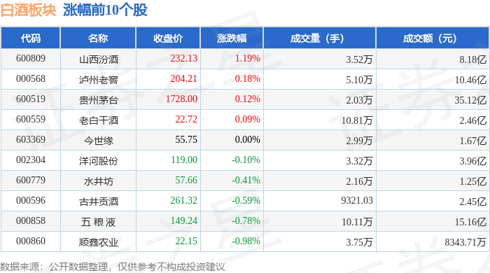 证券之星消息,10月18日白酒板块较上一交易日下跌0.09%,金徽酒领跌。当日上证指数报收于3058.71,下跌0.8%。深证成指报收于9816.68,下跌1.24%。白酒板块个股涨跌见下表: