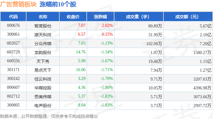 北向资金方面,当日广告营销板块北向资金持股市值为183.45亿元,减持1.18亿元。其中增持最多的是蓝色光标,增持了0.2亿元。减持持最多的是分众传媒,减持了1.45亿元。广告营销板块北向资金持股变动明细见下表: