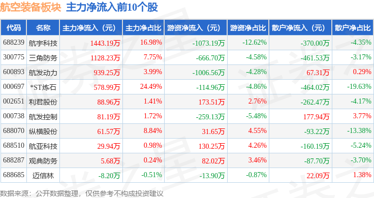 从资金流向上来看,当日航空装备板块主力资金净流出3.18亿元,游资资金净流入131.02万元,散户资金净流入3.17亿元。航空装备板块个股资金流向见下表: