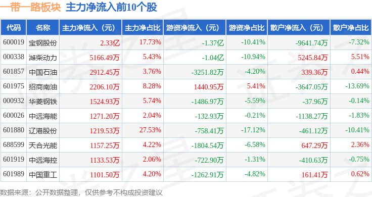 从资金流向上来看,当日一带一路板块主力资金净流出20.11亿元,游资资金净流入1.53亿元,散户资金净流入18.57亿元。一带一路板块个股资金流向见下表: