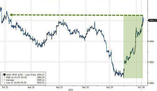 现货黄金最高涨近40美元或涨2.1%,一度升破1960美元整数位,连涨两日至8月1日以来的两个半月最高。现货白银最高涨超2%并一度重上23美元,创9月29日来的两周半最高。