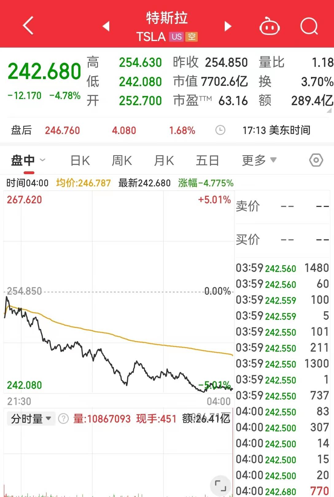 截至收盘,特斯拉报242.68美元,跌4.78%,市值7702.6亿美元,其市值一夜蒸发386亿美元(约人民币2824亿元)。