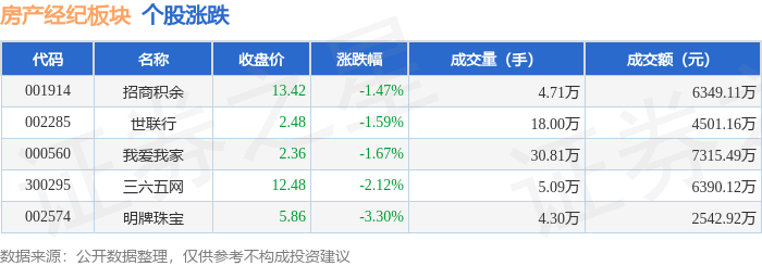 证券之星消息,10月18日房产经纪板块较上一交易日下跌1.76%,明牌珠宝领跌。当日上证指数报收于3058.71,下跌0.8%。深证成指报收于9816.68,下跌1.24%。房产经纪板块个股涨跌见下表:
