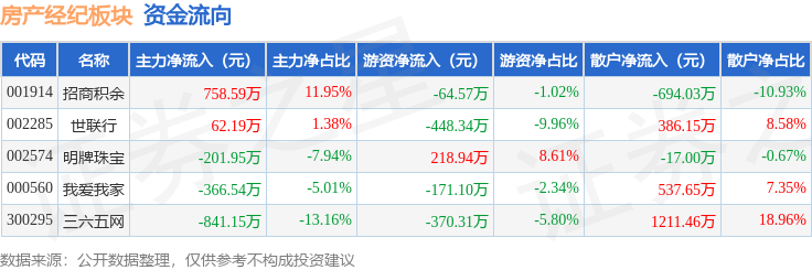 从资金流向上来看,当日房产经纪板块主力资金净流出588.86万元,游资资金净流出835.38万元,散户资金净流入1424.24万元。房产经纪板块个股资金流向见下表:
