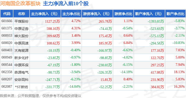 从资金流向上来看,当日河南国企改革板块主力资金净流出4618.83万元,游资资金净流出1522.55万元,散户资金净流入6141.38万元。河南国企改革板块个股资金流向见下表:
