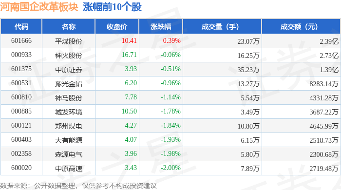 北向资金方面,当日河南国企改革板块北向资金持股市值为28.48亿元,增持0.21亿元。其中增持最多的是神火股份,增持了0.29亿元。减持持最多的是豫光金铅,减持了0.12亿元。河南国企改革板块北向资金持股变动明细见下表: