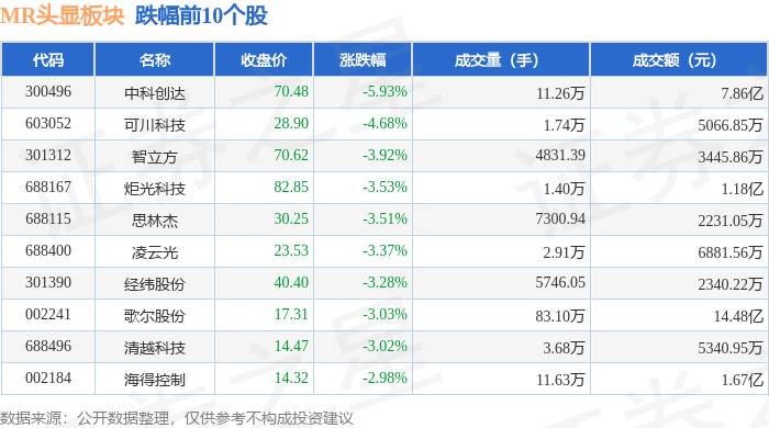 证券之星消息,10月18日MR头显板块较上一交易日下跌1.39%,中科创达领跌。当日上证指数报收于3058.71,下跌0.8%。深证成指报收于9816.68,下跌1.24%。MR头显板块个股涨跌见下表: