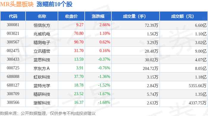 北向资金方面,当日MR头显板块北向资金持股市值为437.22亿元,增持3.32亿元。其中增持最多的是歌尔股份,增持了1.7亿元。减持持最多的是京东方A,减持了0.32亿元。MR头显板块北向资金持股变动明细见下表: