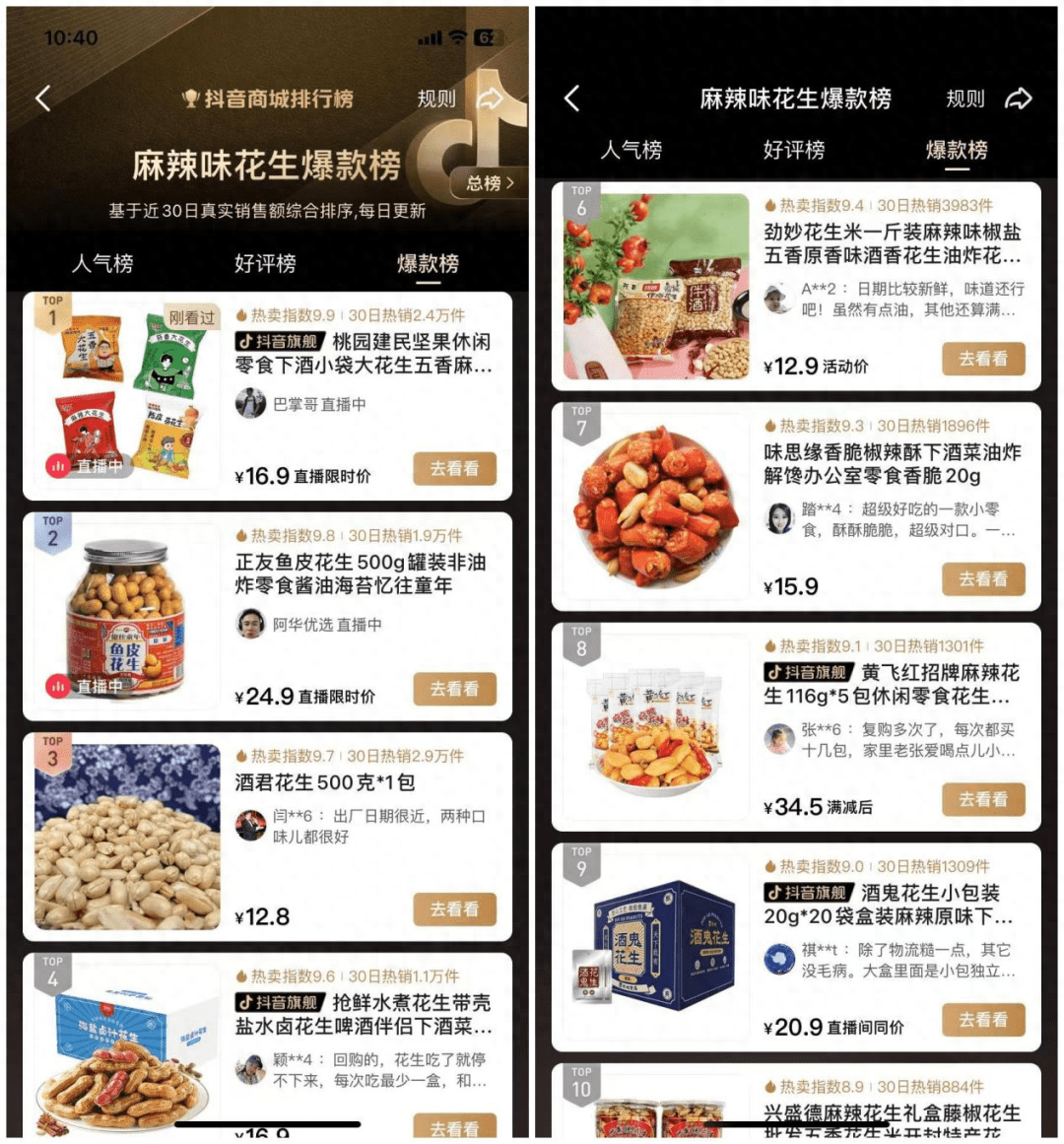 这点不管是从此前良品铺子发力高端零食效果甚微,还是从抖音花生零食中排名较高的产品均是以低价白牌产品为主,均能得到侧面证实。