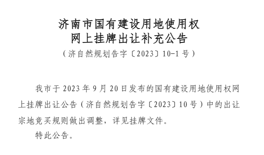 证券时报·券商中国记者了解到,10月9日,济南市自然资源和规划局对即将竞拍的济自然规划告字(2023)9-1号、济自然规划告字(2023)10-1号两批土地的竞买规则做出调整,新公布的挂牌文件显示,土地最高限价取消,出让方式从原来的“限地价、竞建筑品质、现场摇号”调整为“按照价高者得原则确定竞得人”。