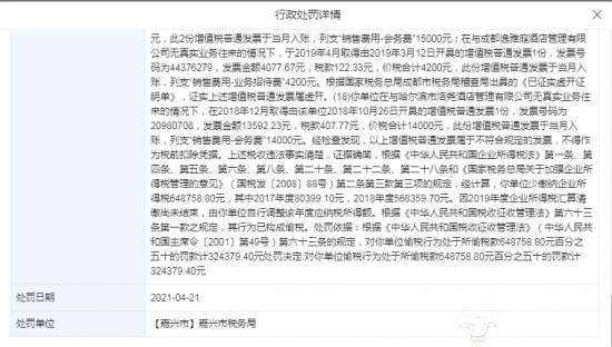 天眼查显示,根据嘉兴市税务局的处罚公告,莎普爱思在2017年7月至2019年7月的两年间,在无真实业务往来的情况下,取得京山福瑞祥商务咨询有限公司、武汉安乐佳咨询服务有限公司、湖北祥和福商务咨询有限公司、樟树市惠奇商务服务有限公司等二十三家公司开具的增值税普通发票,总计有61份这些开具的增值税普通发票大都被莎普爱思列入了“销售费用—市场推广费”项目中。