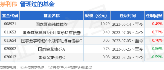 茅利伟先生:中国国籍,上海财经大学管理学硕士。曾任青骓投资固定收益部交易员,上海海通证券资产管理有限公司固定收益一部投资经理。2022年12月加入国泰基金2023年6月14日起担任国泰聚鑫纯债债券型证券投资基金基金经理。2023年8月25日起担任国泰金龙债券证券投资基金基金经理。