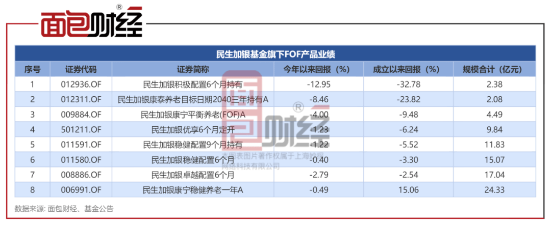目前民生加银基金共在管8只FOF产品(初始基金),成立以来平均收益率为-8.57%,其中7只产品成立至今单位净值收益率为负,同类排名靠后。
