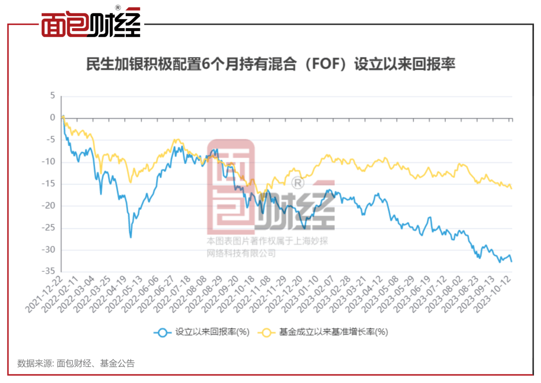 民生加银积极配置6个月持有混合型FOF(简称“民生加银积极配置”)成立于2021年12月,成立以来(截至2023年10月16日,下同)净值累计亏损32.78%。其中,2022年、2023年净值收益分别为-23.30%、-12.95%,业绩表现连续2年在同类产品中排名垫底。