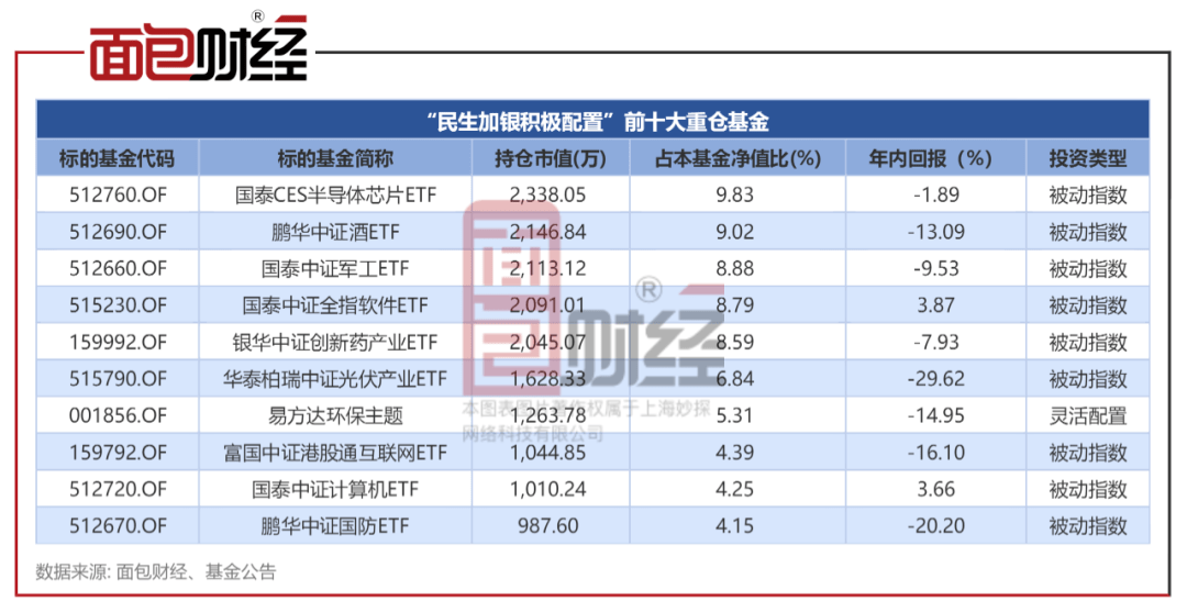 定期报告显示,2023年二季度末,“民生加银积极配置”基金投资占总资产的比例为93.68%,银行存款和结算备付金合计占总资产的比例为5.91%。