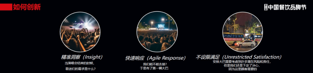 以演唱会为例,3月份我负责海底捞北京大区的工作,有一天我们的工作人员跟我说北京会举办一场演唱会。我就在想,演唱会是一个非常重要的场景,这个场景里顾客的需求是什么?我们能为顾客提供什么?将顾客需要的,我们擅长的,友商没有的,三者画一个圈,中间就是我们创新的点。