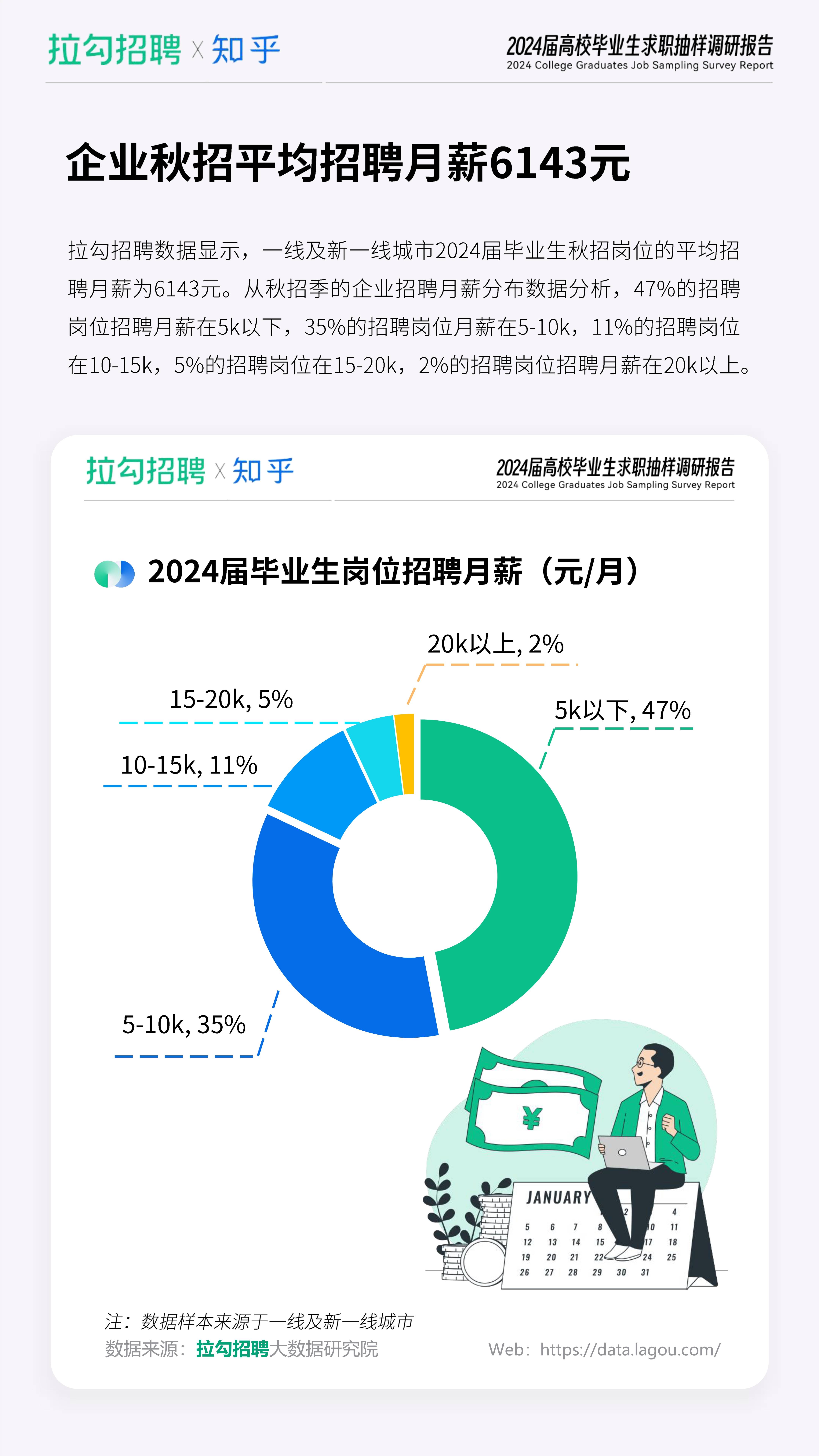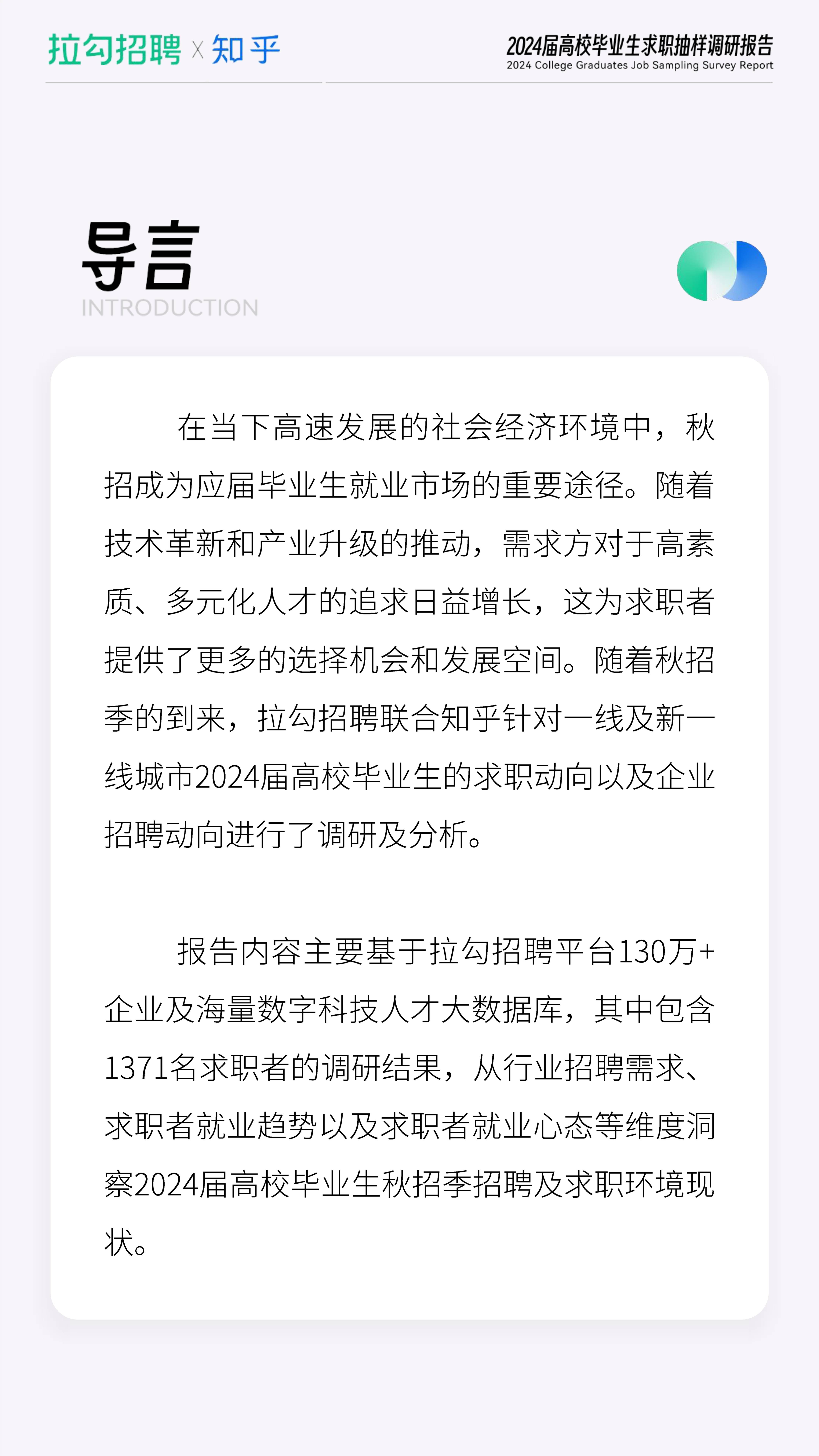 报告内容主要基于拉勾招聘平台130万+企业及海量数字科技人才大数据库,其中包含1371名求职者的调研结果,从行业招聘需求、求职者就业趋势以及求职者就业心态等维度洞察2024届高校毕业生秋招季招聘及求职环境现状。