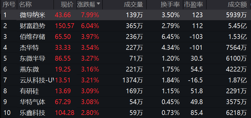 科创100ETF(588190)紧密跟踪上证科创板100指数,截至2023年10月19日10:31,指数成份股中,微导纳米领涨7.99%,财富趋势上涨6.04%,佰维存储、杰华特等个股跟涨超3%。