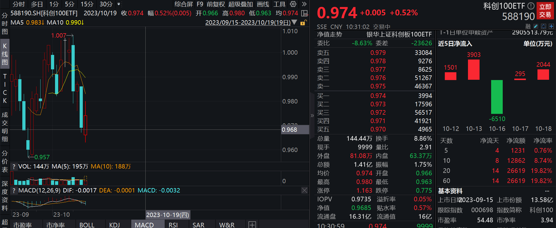截至2023年10月19日10:31,科创100ETF(588190)盘中拉升,已涨0.52%,成交额达1.41亿元,成交额不断扩大,溢价率0.05%,买盘活跃,资金布局意愿强烈。