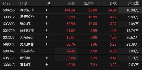 上证报中国证券网讯 据Choice金融终端数据,10月19日早盘,申万一级行业板块中,电子板块表现强势,截至9时50分,赛武纪-U、易天股份、瑞芯微、好利科技、大港股份涨停,海光信息、龙芯中科等跟涨。